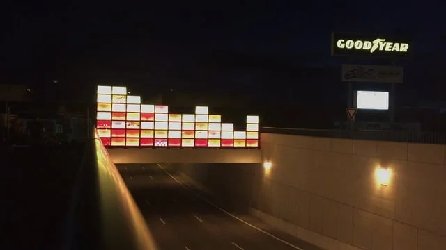 At night the light boxes are lit from within with white LED strip lights. When trains come through town the lights turn off and then come back on through phases, referencing the unstacking and stacking of fruit bins that occurs behind the portal. This occurrence also happens hourly.