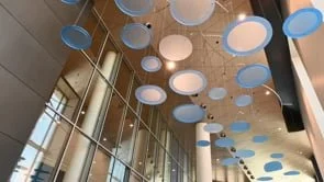 A 70’-long frame of stainless steel pipe, evoking fanning tributaries of the Milwaukee River Watershed, hangs from the ceiling of the Baird Center. The frame supports cables that terminate in blue discs and clear shards. At one end of the installation, elliptical discs are dispersed and perfectly level, resembling broken sheets of ice floating across a lake. In the center, over an escalator, the ellipses transition into circles stacked with rings, spaced closer together to resemble a floe of "pancake ice." At the top of the escalator, the discs transitions to sharp, irregular shapes with prismatic edges that refract sunlight and cast colored spectrums. These tilt up diagonally and vertically, like ice shards formed when waves stack broken sheets of ice together at the shoreline.