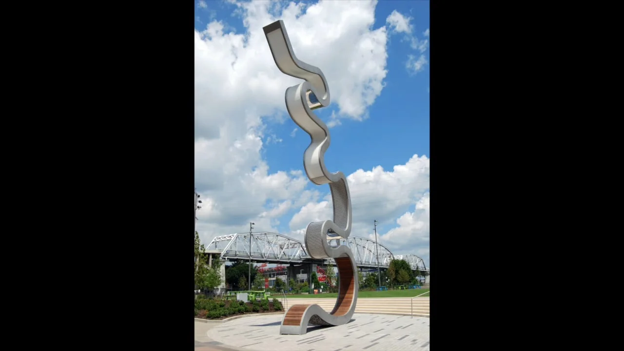 Light Meander, a sculpture in Nashville’s new West Riverfront Park, forms a nexus between the Cumberland River and downtown Nashville. The curvilinear form of the sculpture is based on the meanders of the Cumberland River as it passes through Davidson County.