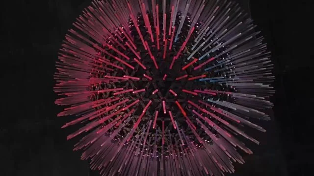 The 27’-tall sculpture is clad in environmentally activated materials that are luminous, colorful and dramatic in the ever-changing sky, sun, wind and landscape. 952 prismatic acrylic rods radiate out from a stainless steel geodesic sphere set on a tripod. The rods are inspired by grasses of the windswept landscape. Like grasses, in heavy winds they quiver and move. Each rod is illuminated by an individually programmable color-changing LED node, resulting in a mosaic of shifting light colors and patterns to create a myriad of spectacular dynamic and vivid nighttime effects. Every night of the week a different moving light show cycles through the sculpture, while holidays are marked by special colors and programs. As the local wind speed picks up, a wind sensor triggers an increase in the speed of the lighting changes. The artwork is a barometer that visualizes and broadcasts wind patterns.