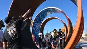 Pipe Dreams, an interactive sculpture in at a skate park, recalls legendary 1970s Arizona skateboarding spot, Desert Pipes. Three large steel pipes create an iconic optical presence in the park, while providing a skateable feature and a hangout spot in the center pipe, which includes a tiled bench and perforated steel mural inspired by swimming pools, also once popular for skateboarding in the valley.